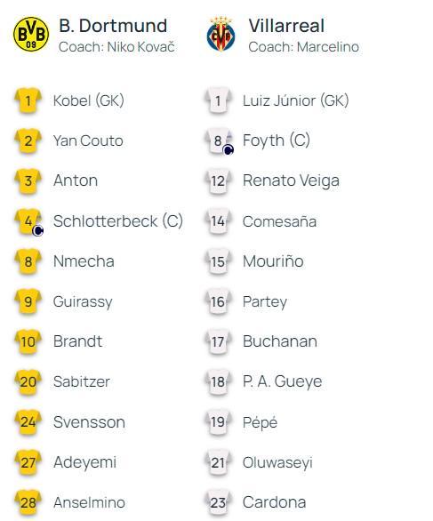 北京时间11月26日4:00,欧冠联赛阶段第5轮,多特蒙德坐镇西格纳-伊杜纳公园球场迎战比利亚雷亚尔,本场主裁判为达维德-马萨,赛前双方首发出炉。